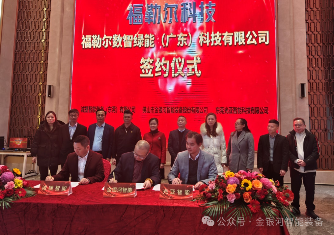 金银河智能董事长张启发、诚捷智能董事长呙德红以及光亚智能董事长曾志永签署了合作协议,三家公司的专业团队将共同入驻福勒尔公司,在新能源电池领域上深化合作,进行优势互补,共同致力于加强整合新能源电池装备产业链,进一步拓展业务发展空间。