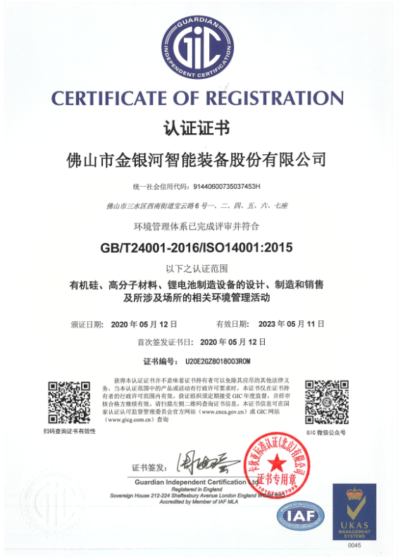 2020年5月,金银河“环境管理体系”完成评审并符合GB/T24001-2016/ISO 14001:2015,认证范围包括有机硅、高分子材料、锂电池制造设备的设计、制造和销售及所涉及场所的相关职业健康安全管理活动。 金银河一直以来都积极推进生产和管理符合环境管理体系,更是响应“十四五”规划,在研发和生产工作上,以降低污染、节能减排为基本准则,严守生态环保底线,体现了金银河的社会责任,勇当环保标兵,积极努力推进和改善生态环境命运共同体。